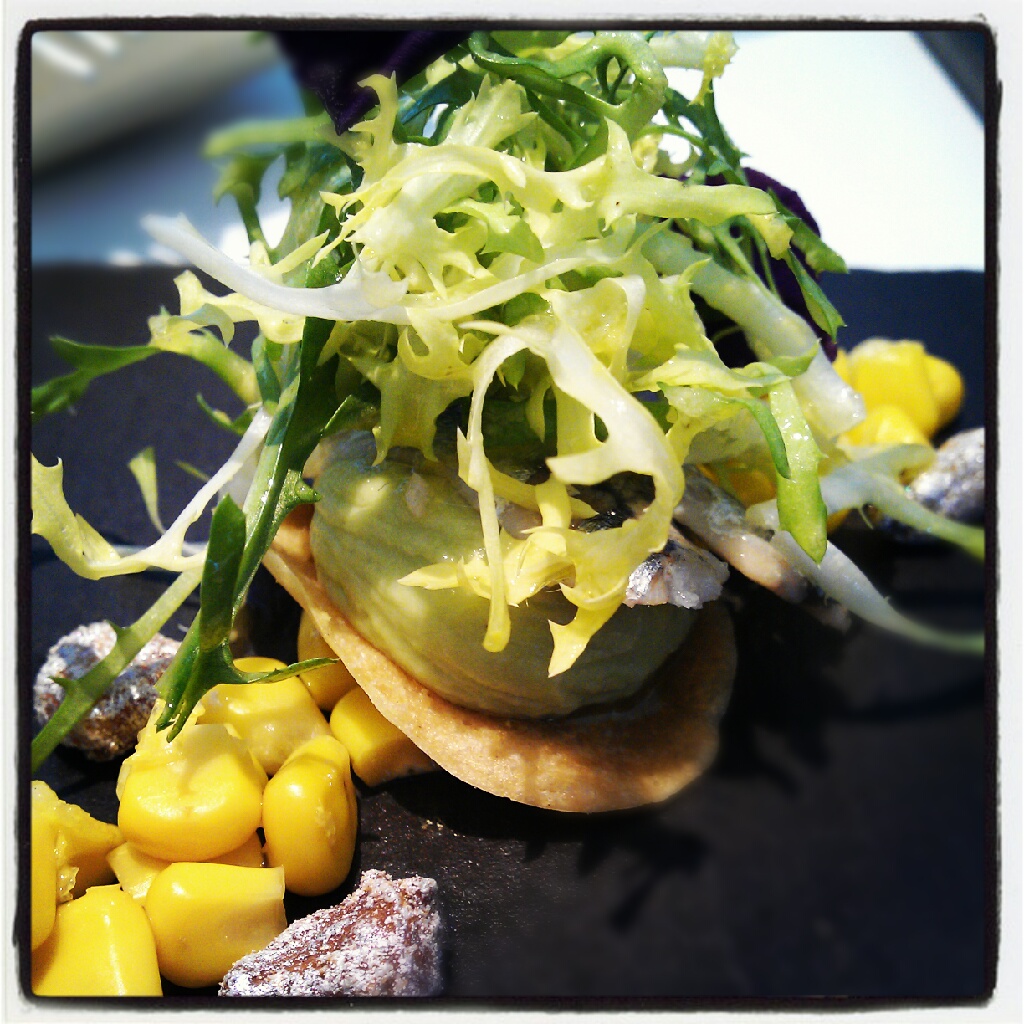 En su conjunto hace un bocado delicioso. La untuosidad del aguacate con el toque de la anchoa asada, el crujiente de los kikos asi como el dulzor del maíz, hace de éste pintxo unammezcla explosiva que funciona a la perfección.