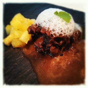Cuando no necesitas cuchillo para comerte una carrillera es la mejor señal y la mejor crítica. La combinación con la piña sada en su punto de textura y dulzor, mas el toque amargo de la espuma de almendras hacen del conjunto un pintxo que no decepciona a nadie. Simplemente perfecto.