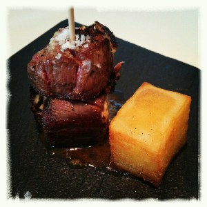 Este es el que parece el pintxo mas sencillo de todos los que comí. Al comertelo te das cuenta del mimo que se ha puesto en este plato. La carne en su punto, dorada por fuera y roja por dentro con su punto de sal en escamas. La patata es lo que mas me sorprendió, a simple vista una patata normal. Por fuera cuadrada pero laminada en su inetrior y con ese punto a vainilla que le da un toque impresionante. Me quedó la curiosidad de ver su helaboración para que quedara laminada, crujiente y tierna. Excepcional.