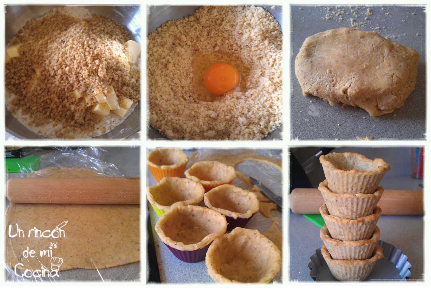 Empezaremos preparando la base de la tarta. Para ello trituraremos las nueces y las mezclaremos con la harina, el azucar glas y la pizca de sal. A continuación añadiremos la mantequilla fría cortada en dados pequeños. Tendremos que ir frotando con las manos, sin amasar hasta conseguir una especie de harena mojada. A continuación añadiremos el huevo, mezclaremos hasta conseguir una masa homogenea. Envolveremos en film transparente y dejaremos reposar en el frigorífico al menos una hora.