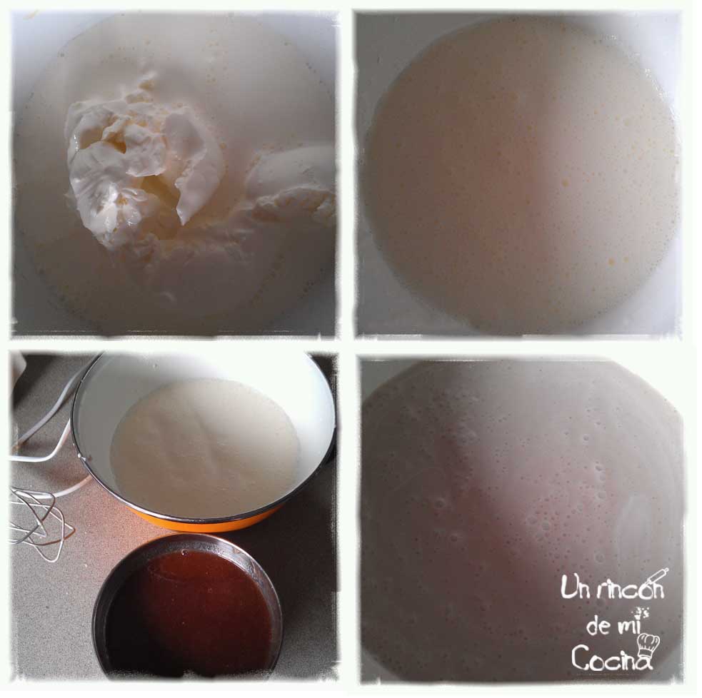 Por otro lado semimontaremos la nata bien fría, añadiremos el queso Philadelphia, mezclaremos hasta conseguir una masa homogénea. Por último añadiremos la leche. Cuando tengamos als dos mezclas las juntaremos. Taparemos con film transparente y dejaremos enfriar un par de horas en el frigorífico.