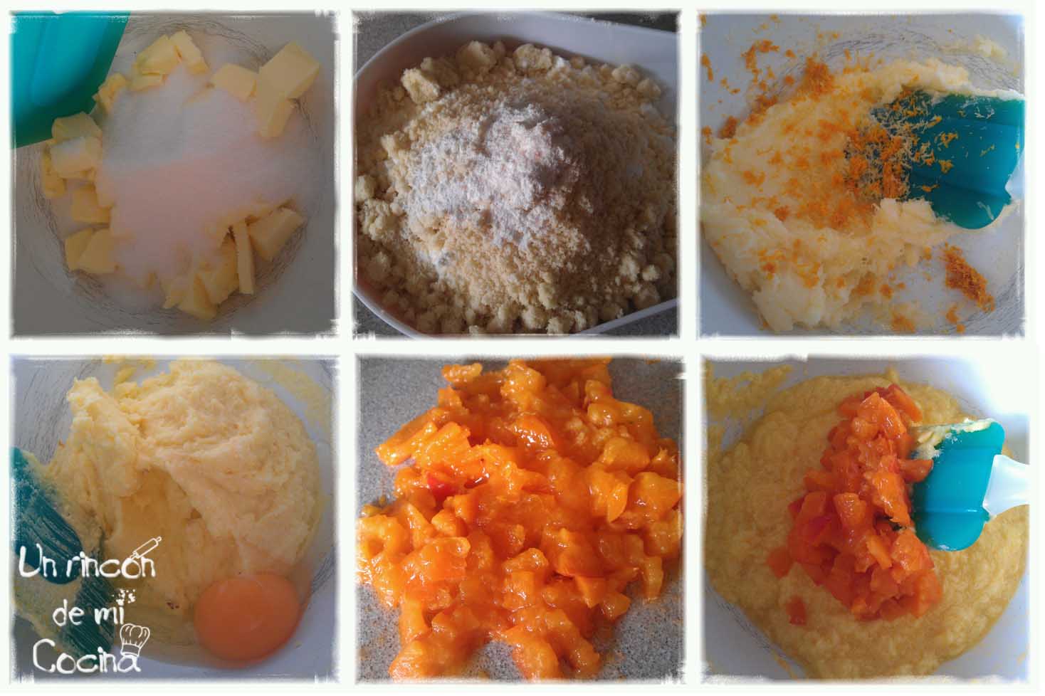 Por otro lado mezclaremos los ingredientes secos. La harina, la almendra molida, la media cucharilla de levadura Royal y la pizca de sal. Añadiremos el huevo a la crema de mantequilla y azucar y cuando esté bien integrado añadiremos los dos albaricoques maduros cortados en daditos, removiendo con mucha suavidad. Por último iremos integrando la mezcla de harina, almendra y la levadura.