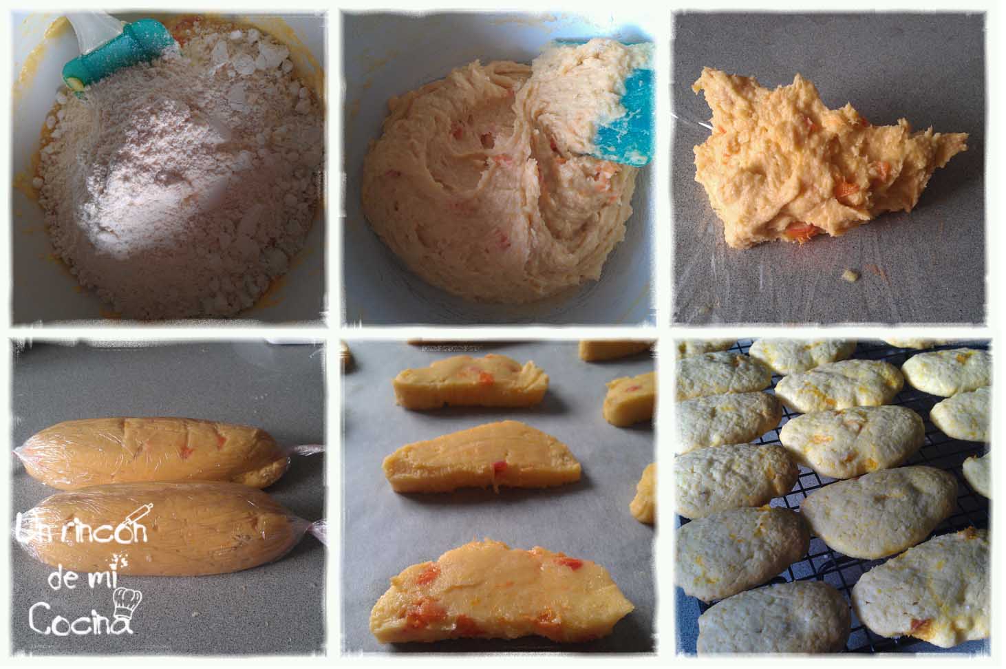 Cuando tengamos una masa homogenea haremos un rulo con film transparente y guardaremos en el frigorífico. Eso es lo que hice yo pero hubiera estado mejor meter la mezcla en una manga pastelera y hubiera hecho unas galletas redonditas. La masa es demasiado blanda y yo tenia muy poco tiempo para esperar por eso me han quedado un poco amorfas.