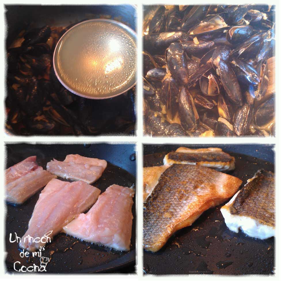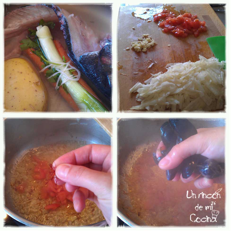 A continuación picaremos la cebolleta y el ajo. Pondremos a pochar en una cazuela con un chorro de aceite de oliva. Cuando esté pochado añadiremos el tomate pelado, despepitado y picado en dados. También echaremos unas hebras de azafrán, removeremos bien y añadiremos los mejillones. Una vez se empiecen a abrir cubriremos con el el fumé y dejaremos cocinar unis 10/15 minutos.