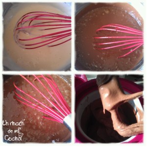 Pondremos en un cazo al fuego  la leche, la nata y el azucar. Removeremos hasta que el azucar se disuelva, en ese momento añadiremos el chocolate. Cocinaremos a fuego medio, sin parar de remover hasta que el chcocolate se disuelva del todo.