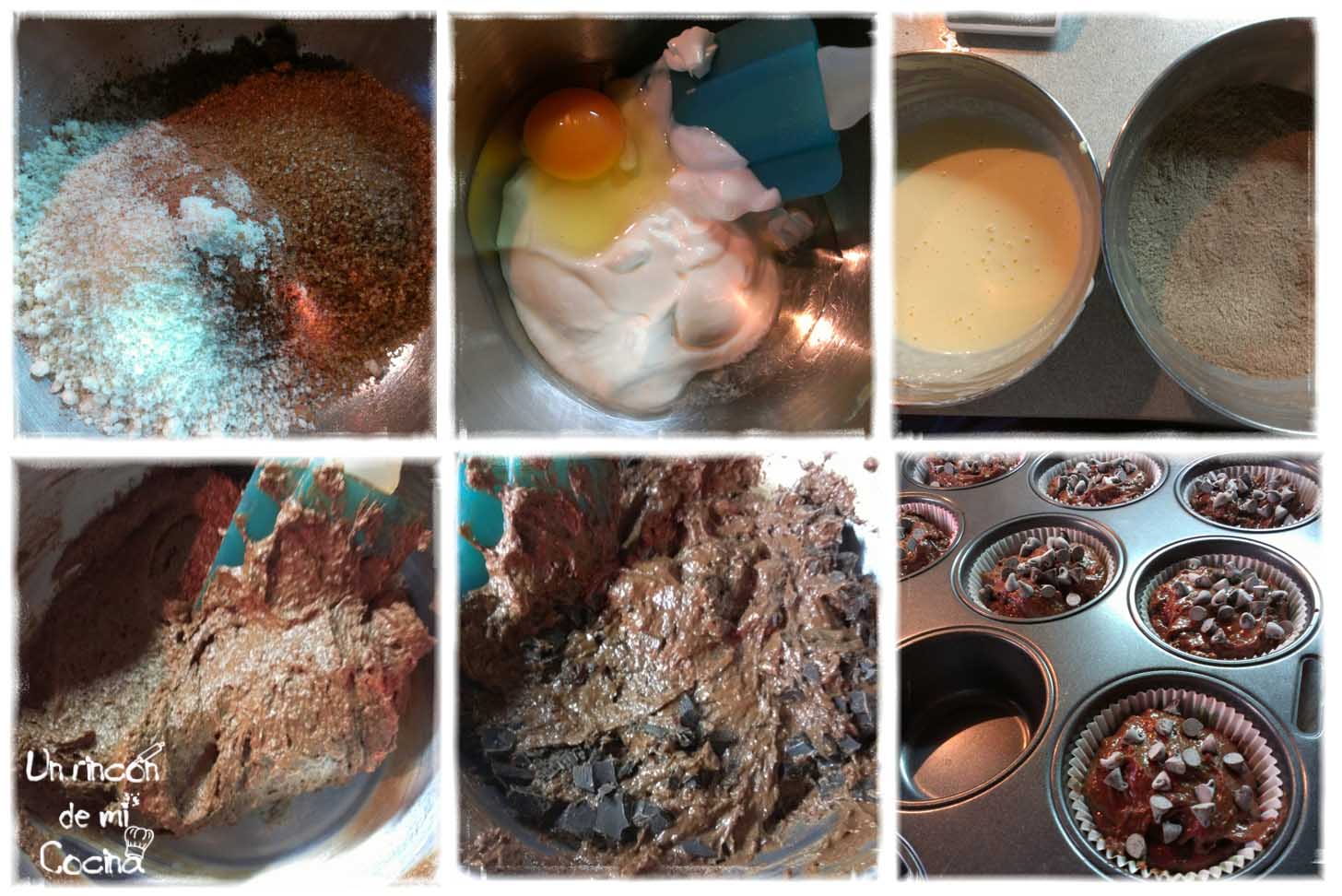 Mezclaremos los ingredientes secos, la harina, el cacao, el sobre de levadura y la almendra molida. Por otro lado mezclaremos los huevos con el yogurt, el ázucar y la mantequilla. Sin batir en exceso, cuando la mezcla este homogenea la mezclaremos con los ingredinetes secos.
