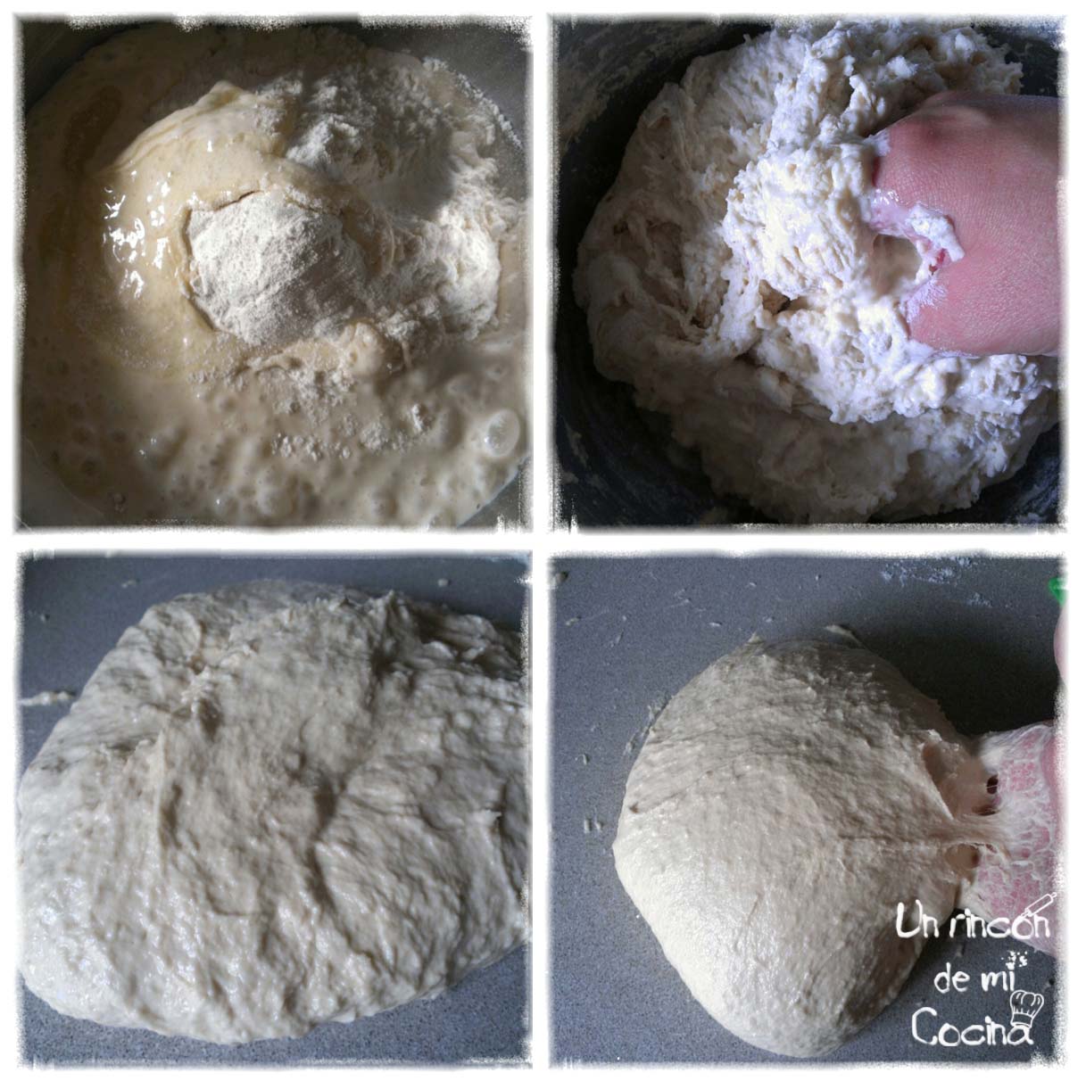 Empezaremos poniendo en un cuenco todos los ingredientes. Amasaremos mezclando todos los ingredientes muy bien, cuando veamos que tenemos una masa mas o menos bien mezclada la echaremos a la encimera y nos dispondremos a amasar. Haremos ciclos de amasado de 30 segundos y dejaremos reposar 10 minutos. Repetiremos este proceso unas 4 o 5 veces o hasta que veamos que nos queda una masa suave y tersa.