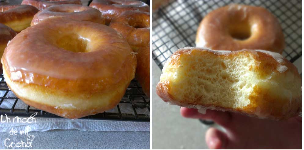 Una vez fritos los sacaremos a papel absorvente para quitar el exceso de grasa, pasándolos depués a una rejilla para que se enfríen. Una vez frios los pasaremos por la glasa y los dejaremos reposar nuevamente sobre la rejilla.