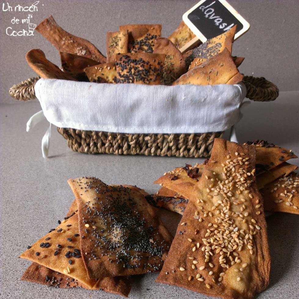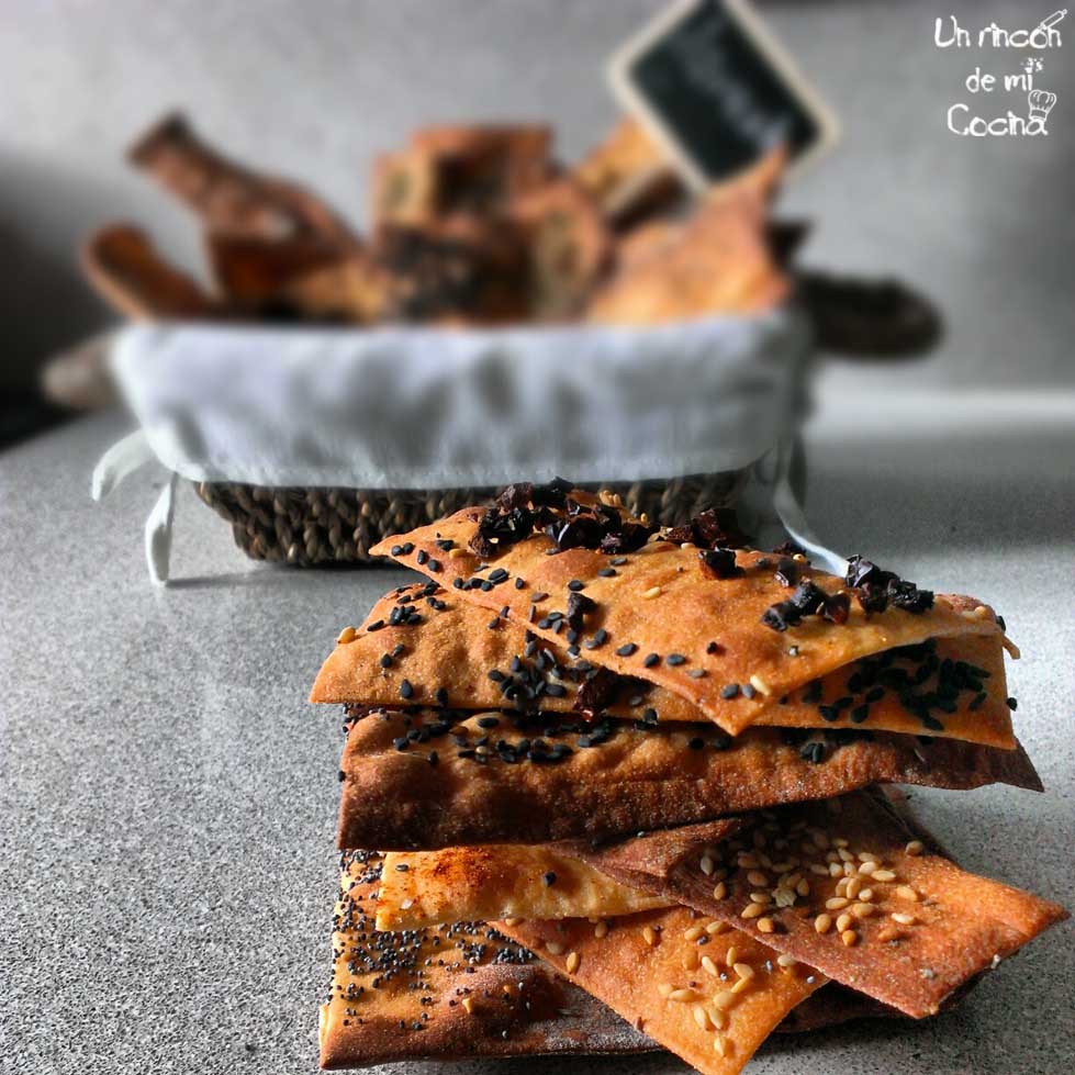 Pulverizaremos agua encima de la masa e iremos poniendo las semillas y las especias que más nos gusten, pocas porque la masa es muy fina. Yo le puese orégano, pimentón, sésamo, amapola, tomillo, tomate seco y sal en escamas. Cortaremos, no hace falta que sea uniforme, la gracia está en que queden irregulares y hornearemos a 180 grados unos 15 o 20 minutos.