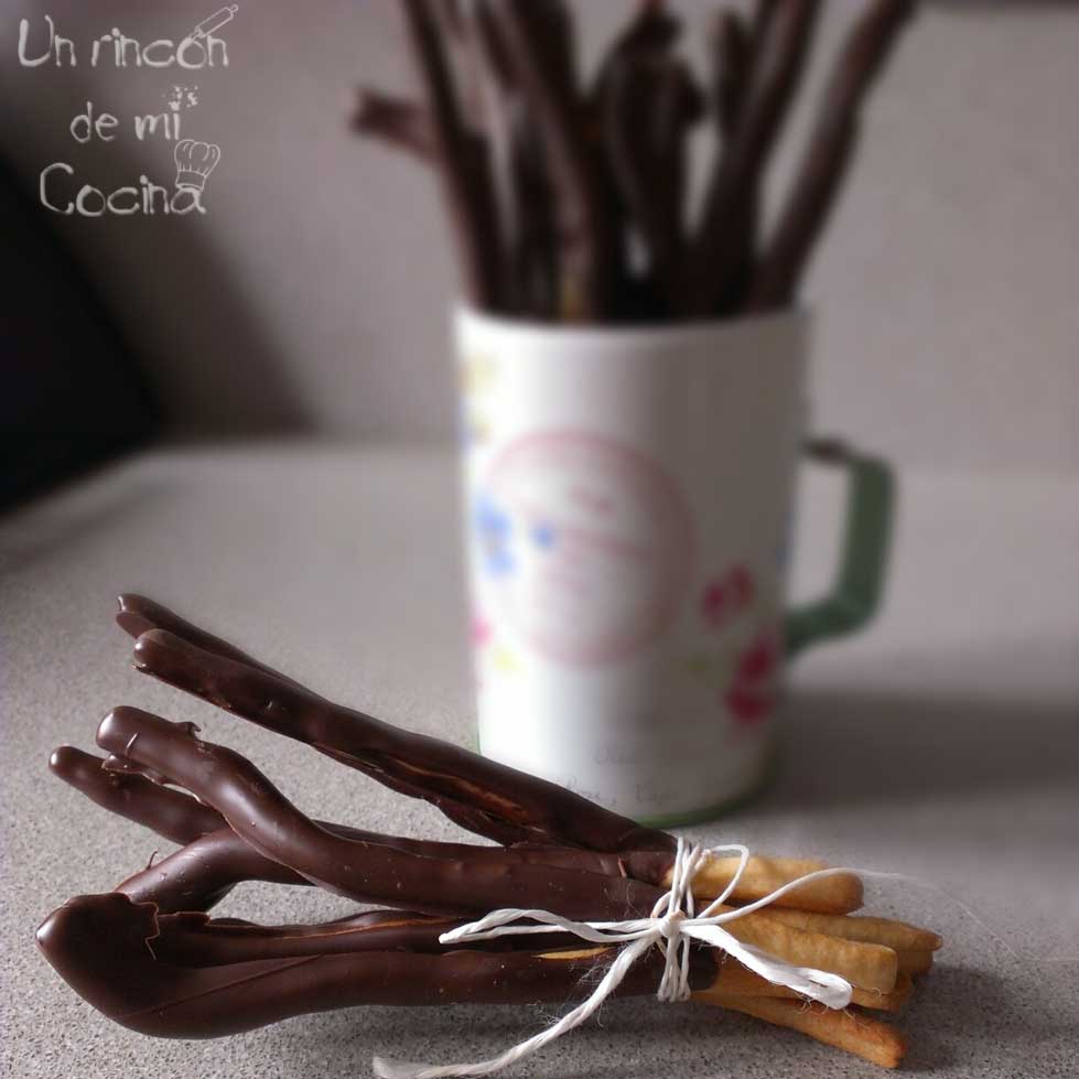 Fundiremos el chocolate en el microondas o al baño María, untaremos los palitos y los volveremos a dejar sobre el papel de hornear para que una vez se endurezca el chocolate los podamos despegar con facilidad. Los podemos enfriar de una manera más rápida en el frigo o a temperatura ambiente.