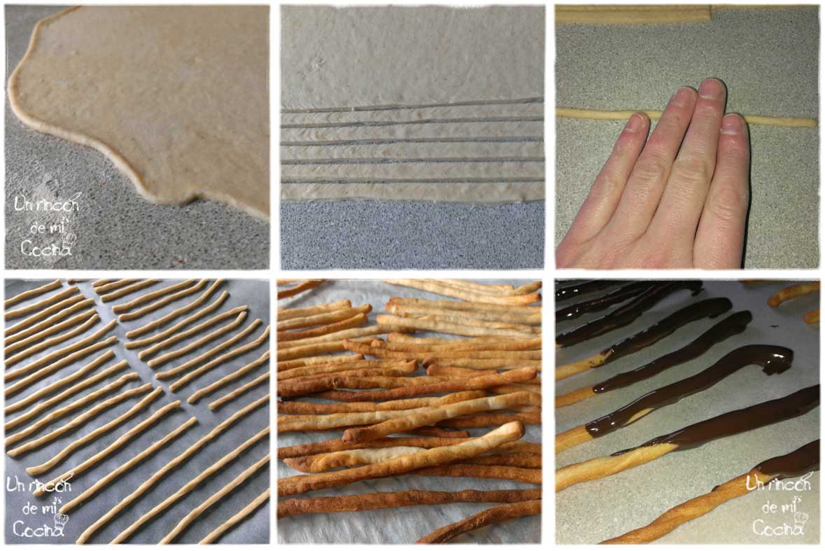 Estiraremos la masa con un rodillo, si se nos resiste dejaremos reposos de un minuto entre pasada y pasada para que la masa sea más manejable. Intentaremos que nos quede de un grososr de unos 0,5 mm. Haremos tiras de unos 10 centímetros de largo y un centímetro de ancho. Iremos sacando las tiras y redondeandolas manejándola como si fuera plastilína. Los colocaremos sobre una bandeja con papel de hornear dejando un poco de margen entre unos y otros. Hornearemos a 200 grados unos 10 minutos, estad atentos para que no se os quemen. Sacaremos sobre una rejilla para que se templen.