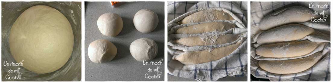 Transcurrido este tiempo quitaremos el gas a la masa , dividiremos la masa en unas 5 porciones de unos 150 gramos cada una, bolearemos y dejaremos reposar unos diez minutos encima de la mesa de trabajo. Les daremos forma de barrita, aplanando y formando un churro dándole tensión y cerando bien los costados. Dejaremos levar unos 90 minutos, cortaremos para que greñen de una manera bonita y hornearemos con el horno caliente a 210 grados los primeros 5 minutos con humedad y 10 minutos mas a 2oo grados. Sacaremos y dejaremos enfriar sobre una rejilla.