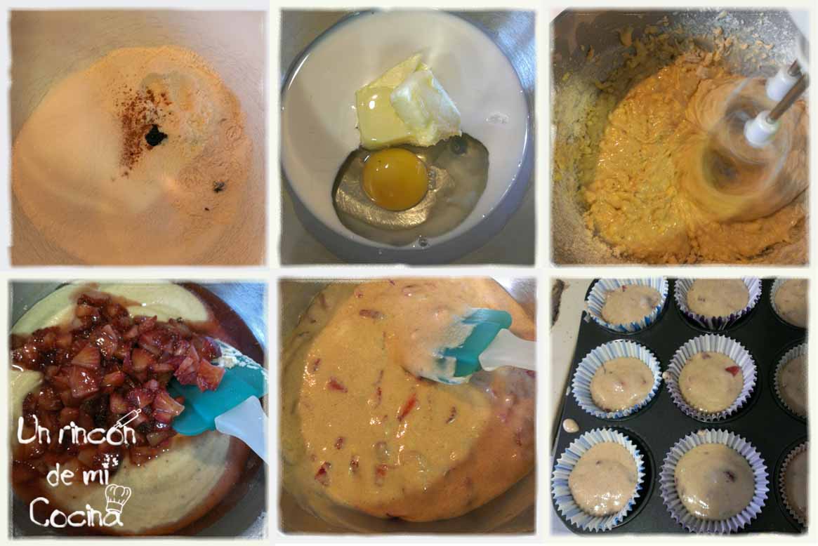 Empezamos mezclando por una lado la harina, 75 gramos de azúcar, la canela, la vainilla y el Royal. Por otro lado trocearemos las fresas y las mezclaremos con los 25 gramos de azucar que nos ha sobrado, las dejaremos macerar unos minutos. Haremos la mezcla de la leche, con la mantequilla pomada y el huevo, cuando tengamos la mezcla bien hecha juntaremos los ingredientes secos con estos últimos.