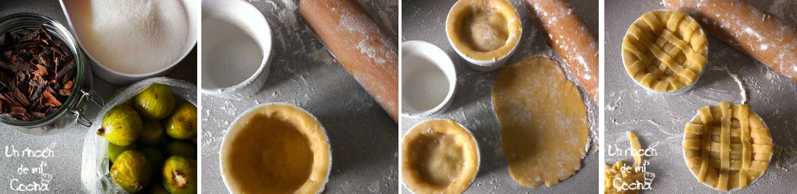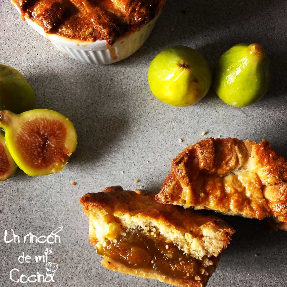 Utilizaremos unos cuencos individuales aptos para el horno, los untaremos con mantequilla y harina. Echaremos un poco de harina en la encimera y estiraremos la masa con mucho cuidado, forraremos todo el cuenco hasta el borde.  Rellenaremos de la compota de higos que hemos preparado y taparemos con masa estirada, cerraremos las tartitas y si somos hábiles decoraremos con un poco de masa. Pintaremos con huevo batido y hornearemos a 180 grados unos 25/30 minutos. Sacaremos y dejaremos enfriar antes de consumir.