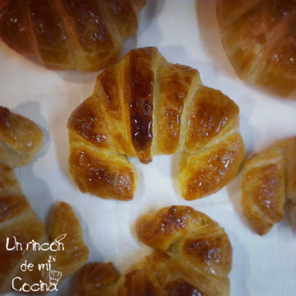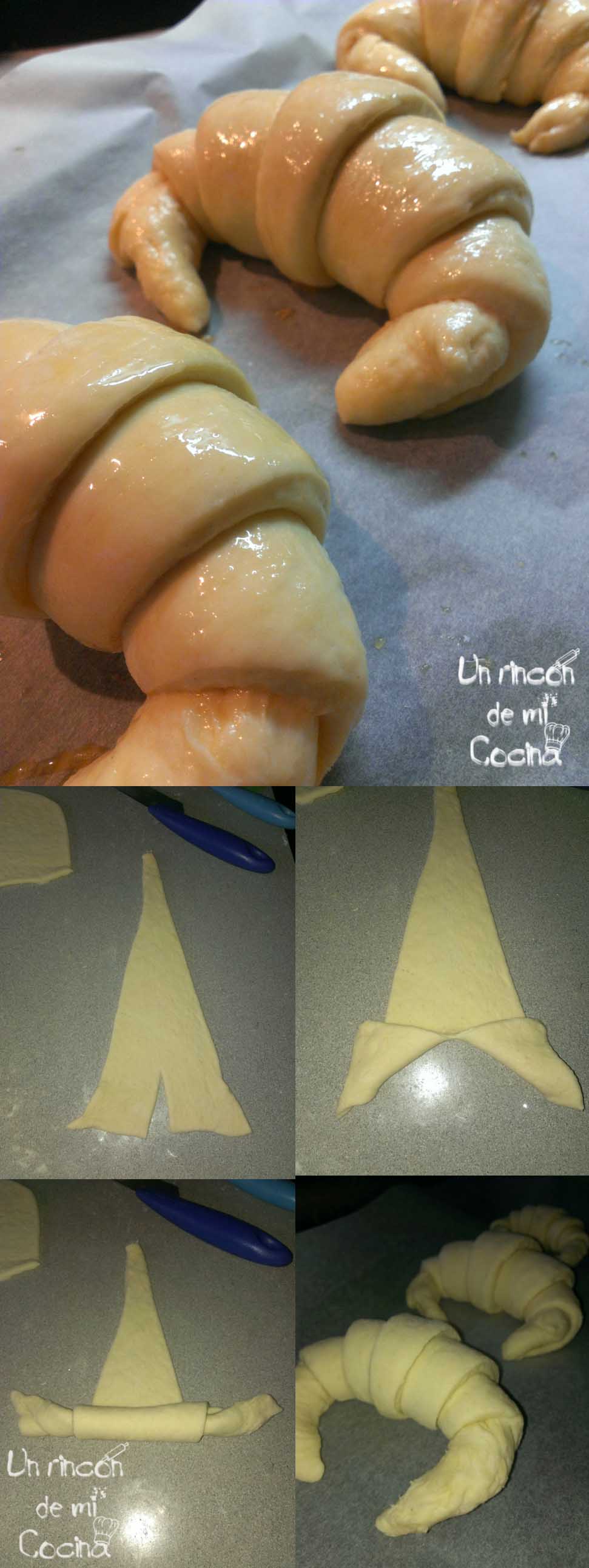Cortaremos la masa en triángulos, haremos un corte en la base del triángulo, sacaremos las puntas para afuera e iremos enrollando hasta ariba. Iremos colocando los cruasanes en una bandeja y dejaremos fermentar 90 minutos y 30 minutos más dentro del frigo. Sscaremos, pintaremos con huevo batido y hornearemos a 180 grados 17/20 minutos. Dejaremos enfríar antes de pintar con el almíbar (según gustos, se puede dejar sin almíbar) y estarán listos para consumir.
