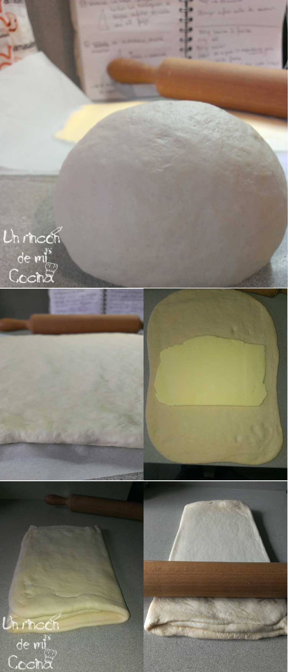Colocaremos la mantequilla en mitad de la masa y la taparemos con los dos lados como si la arroparamos. Estiraremos con el rodillo siempre en la misma dirección, cuando tengamos una lámina larga haremos tres pliegues, empezando de los costados para adentro y dejaremos reposar 20 minutos en el frigorífico. Sacaremos la masa y estiraremos igual que la anterior vez y plegaremos en tres, otra vez meteremos al frigorífico para que la mantequilla no se derrita. Repetiremos esta secuencia tres o cuatro veces. Estiraremos la masa y cortaremos los triángulos para formar los cruasanes, que sean de entre 60/80 gramos y 1/2 centímetro de grosor.