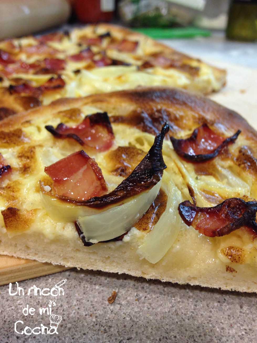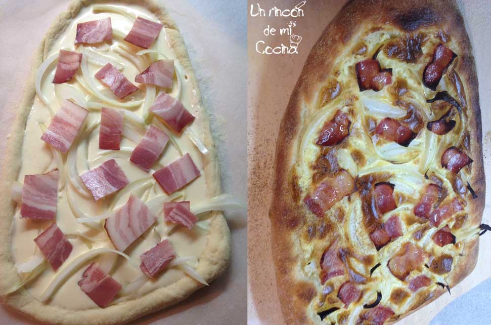 Empezaremos batiendo la crème fraîche, la yema, la harina, la sal y la pimineta negra (en el libro también añade nuez moscada, yo me la salté). Cortaremos la cebolla en rodajas finas y cortaremos también la panceta en cuadrados. Estiraremos la masa de pizza y le daremos un poco de forma a los bordes para que no se nos salga la mezcla de la crema fresca, echaremos la crema y sobre ésta la cebolla y la panceta.