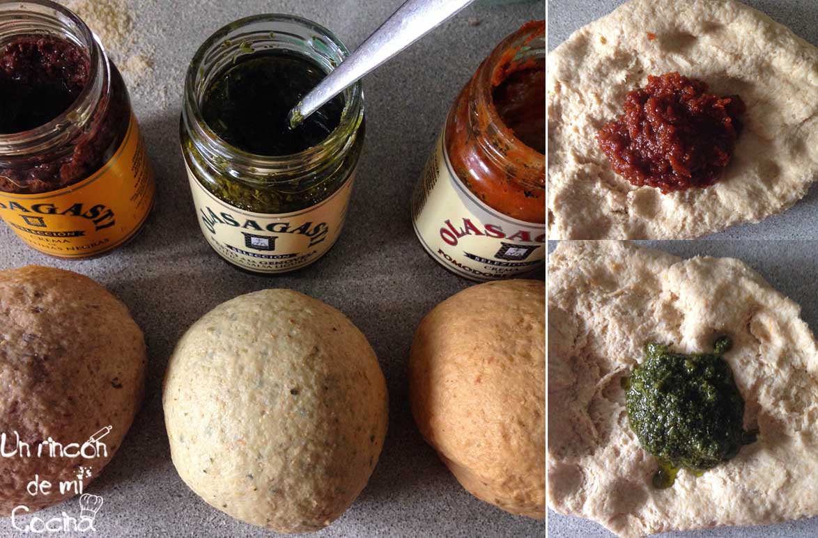 de tomate seco por un lado, pesto por otro y aceituna negra para terminar.