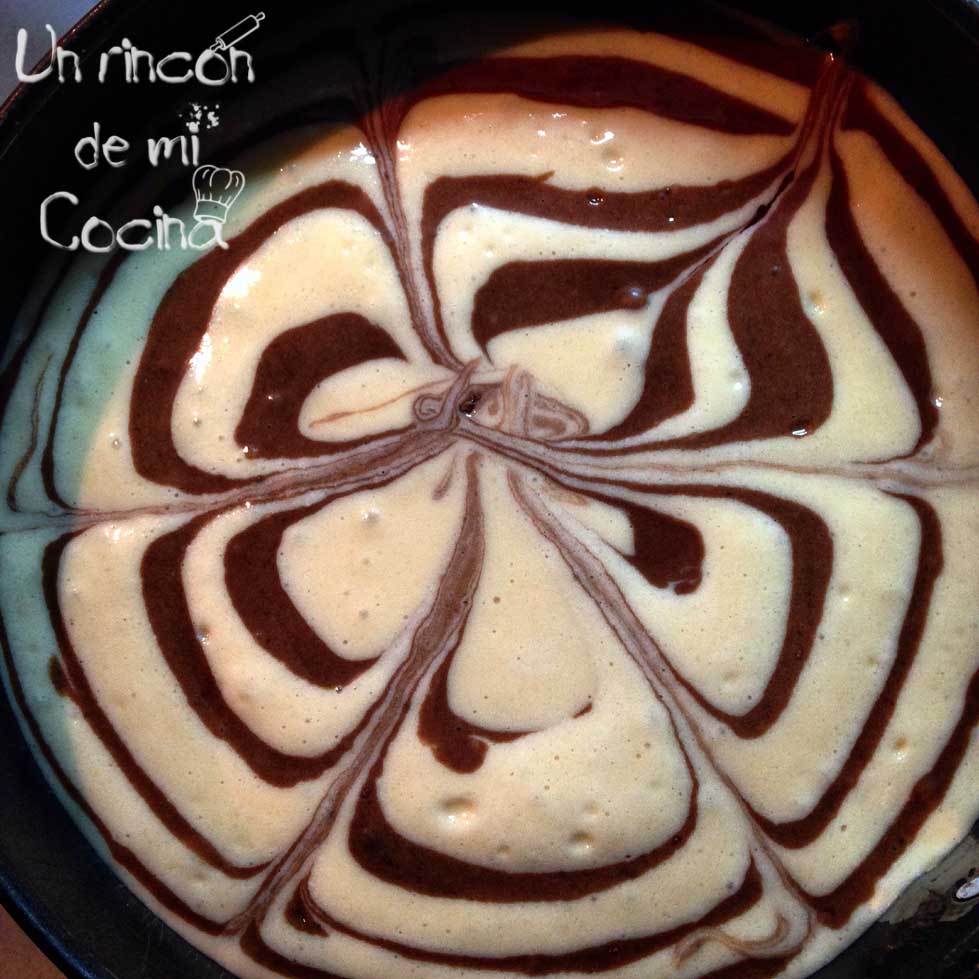 Utilizaremos un molde desmoldable, iremos añadiendo cucharas de masa alternando la de cacao y la blanca y así conseguiremos el bizcocho cebra. Lo hornearemos a 180 grados unos 45 minutos. Sacaremos del horno y dejaremos enfriar.