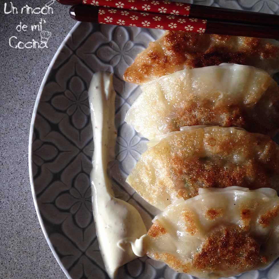 Pondremos una cuchara sopera de aceite en una sartén y cuando empiece a humear añadiremos las gyozas, las tendremos hasta que empiecen a dorarse, en ese momento echaremos agua sin llegar a cubrir, justo que cubra el fondo, cerraremos con una tapa y las dejaremos cocinar hasta que el agua se evapore (unos dos o tres minutos mas o menos). Sacaremos y las acompañaremos de nuestra salsa favorita. En este caso yo las acompañé de una mahonesa con mostaza.