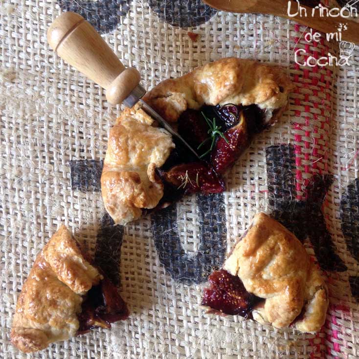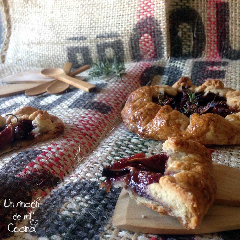 Lavaremos y cortaremos los higos en cuartos y reservaremos. Sacaremos la masa de las galletes del frigorífico, pondremos los higos en el centro dejando dos o tres dedos de masa para poder cerrarlas, les echaremos azúcar al gusto y unas cuantas hojitas de romero fresco, cerraremos haciendo pliegues por toda la vuelta y dejaremos en el centro sin cerrar.