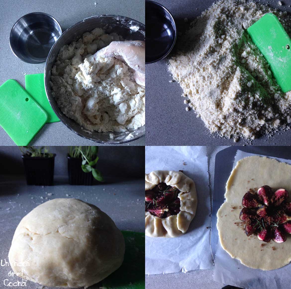 Empezaremos preparando la masa. Pondremos en un cuenco la harina, el azúcar y la sal. Por otro lado cortaremos la mantequilla en dados y la añadiremos a los ingredientes secos, con las manos iremos mezclando e intentando crear una textura de haremos mojada, intentaremos non tocar demasiado para no calentar la mantequilla. Cuando tengamos algo mas o menos homogéneo lo echaremos en la encimera e iremos añadiendo poco a poco el agua fría, mezclaremos con la ayuda de una rasqueta o espátula. Una vez tengamos una masa con la cual podamos formar una bola la porcionaremos en 100 gramos para una gallet de ración o a 150 gramos para hacerlas mas grandes, las dejaremos reposar en frío.