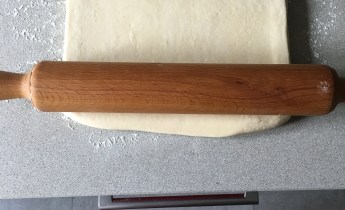 Pasada ésta hora volveremos a estirar y haremos un tercer pliegue, dejaremos otra vez una hora en frío y nos dispondremos a estirar, dejando un grosor de masa de medio centímetro. Cortaremos a unos 20 centímetros de ancho y una base de unos 9 centímetros. Intentaremos que al formar los cruasanes tengan 7 vueltas y pesen unos 80 gramos (esta parte también es mejor que la veáis en el vídeo).