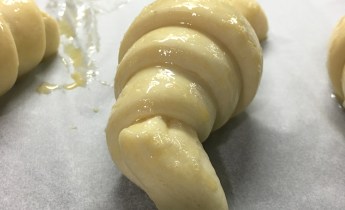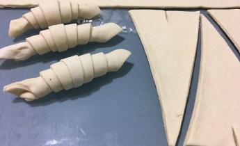 FORMADO: Una vez tengamos los triángulos cortados, les haremos un corta en la mitad de la base de unos 3 centímetros. Estiraremos ligeramente desde la punta y la pegaremos con suavidad a la mesa. Abriremos las dos pares del corte hacia los lados y estiraremos dando una leve tensión hasta enrollar del todo. El cierre nos tiene que quedar siempre abajo. Los iremos poniendo en una bandeja de horno con papel de hornear, dejando espacio entre ellos para que crezcan.