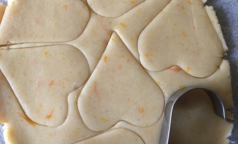 Empezaremos cortando la mantequilla fría en dados pequeños y restregándola con la harina hasta conseguir la textura de arena húmeda. Por otro lado pesaremos el azúcar, rallaremos la piel de naranja y añadiremos el huevo. Todo esto lo juntaremos con la harina, la mantequilla, la sal y el Royal. Cuando tengamos una masa homogénea haremos una placa de un par de centímetros de grosor y la dejaremos en el frigorífico al menos media hora, si puede ser un poco más mejor, y si tenéis prisa la podéis meter diez minutos al congelador.
