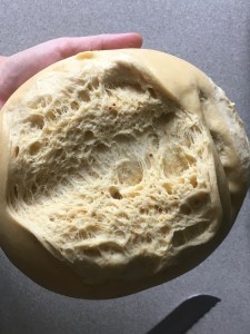 Ésta es una masa que tenemos que hacer con un día de antelación y dejar fermentando en frío. Empezaremos poniendo la harina, la levadura fresca y la sal en un cuenco grande. A continuación añadiremos el líquido, en el caso del aceite siempre quedará mas jugoso si es aceite del sofrito que haremos para el relleno pero aceite normal también nos valdrá.