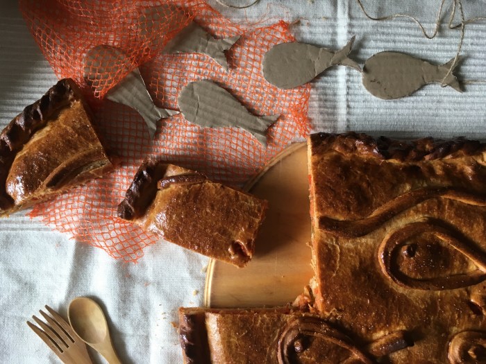 Al día siguiente sacaremos la masa y el relleno. No hace falta atemperar la masa, es bastante manejable así fría. Partiremos la masa en dos trozos, unos de ellos un poco mas grande que el otro. Estiraremos en forma rectangular y lo pondremos sobre papel de hornear, pondremos el rellenos dejando un margen en los bordes de dos dedos.