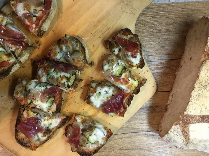 Rebenada de pan que meteremos al horno unos minutos para secar la superficie. Sobre esa rebanada pondremos salsa de tomate o tomate en dados, verduras salteadas, algo de embutido y mozarella o algún queso fundente. Orégano y con el gratinador a 240 justo unos minutos para que se derrita el queso y se dore un poco. Sacar y a disfrutar.